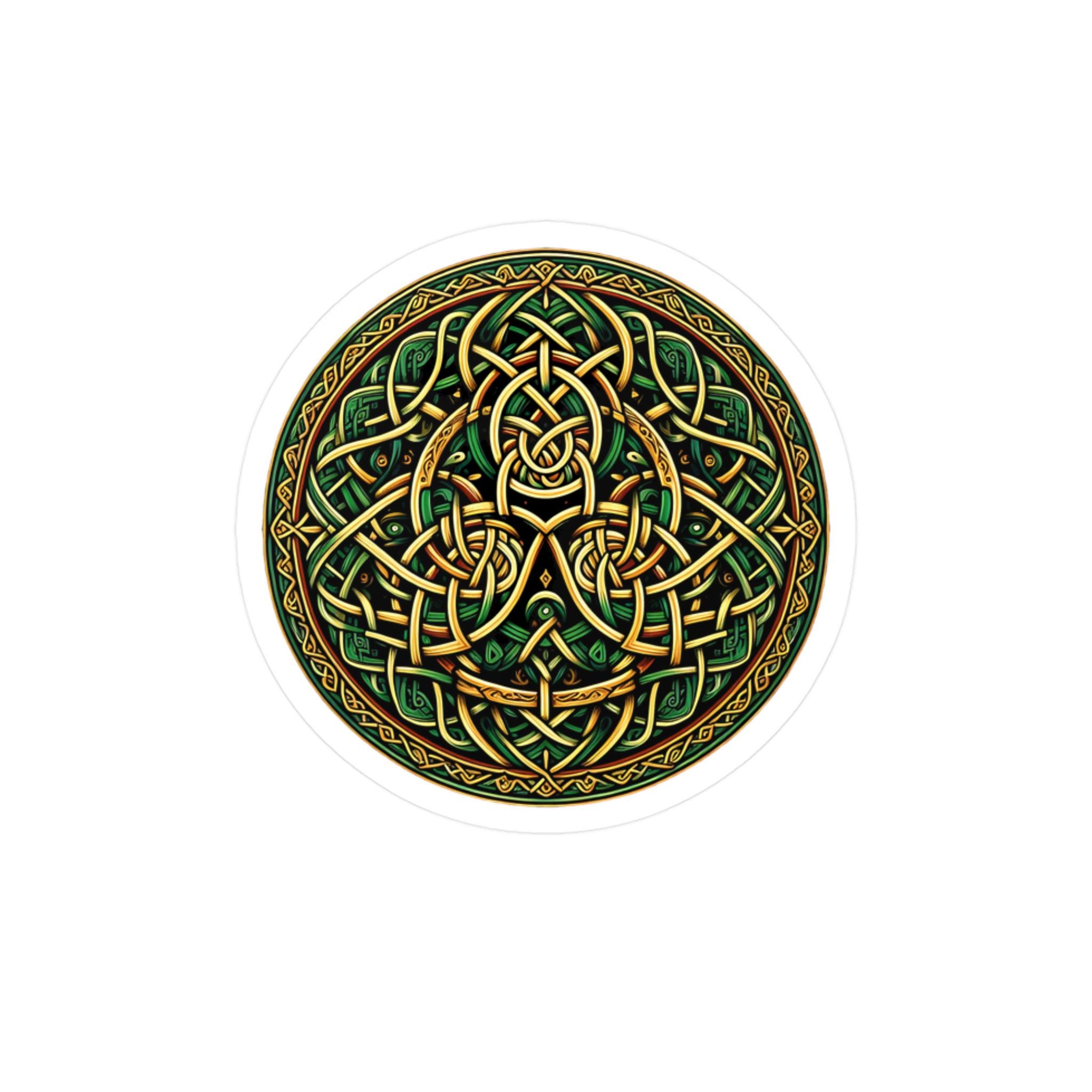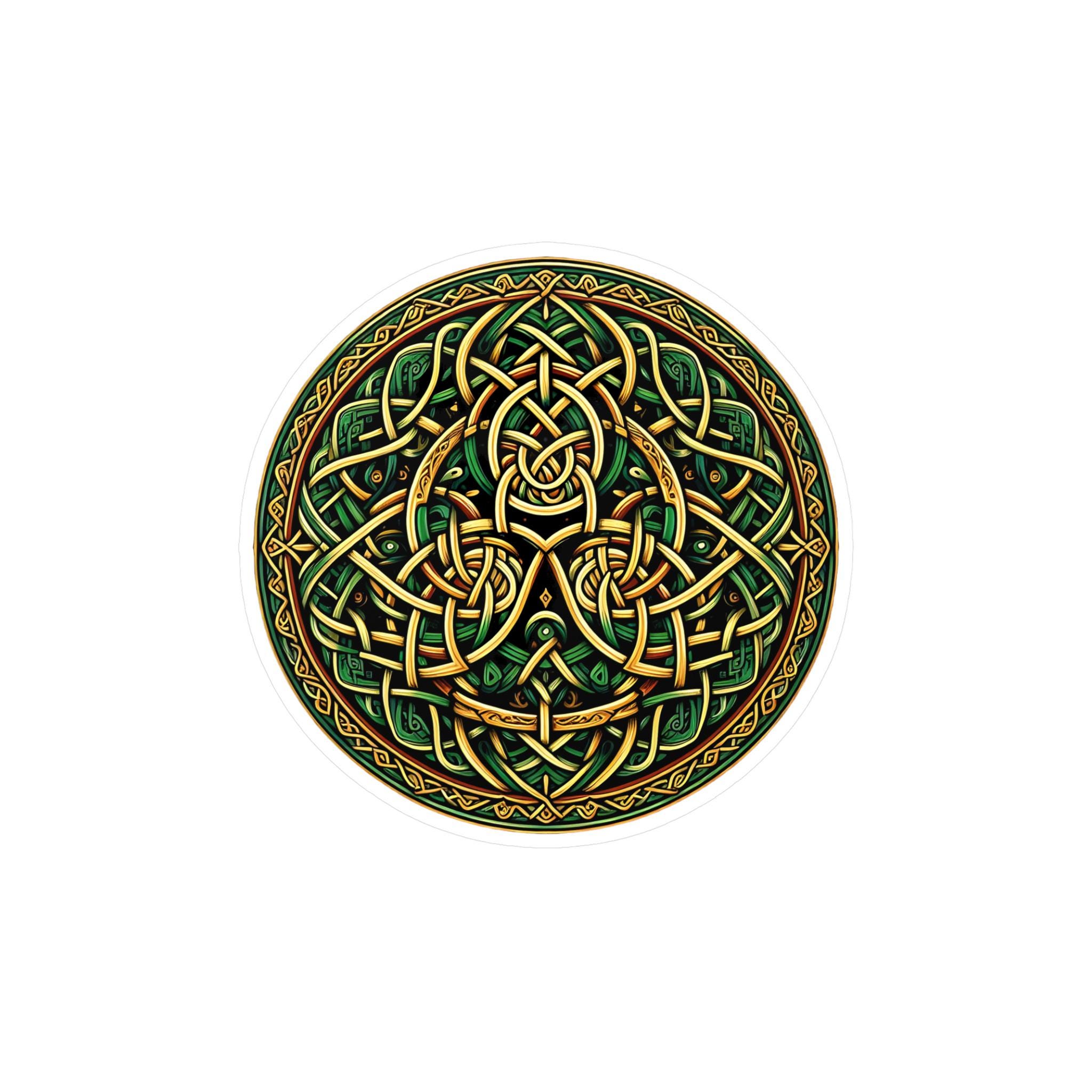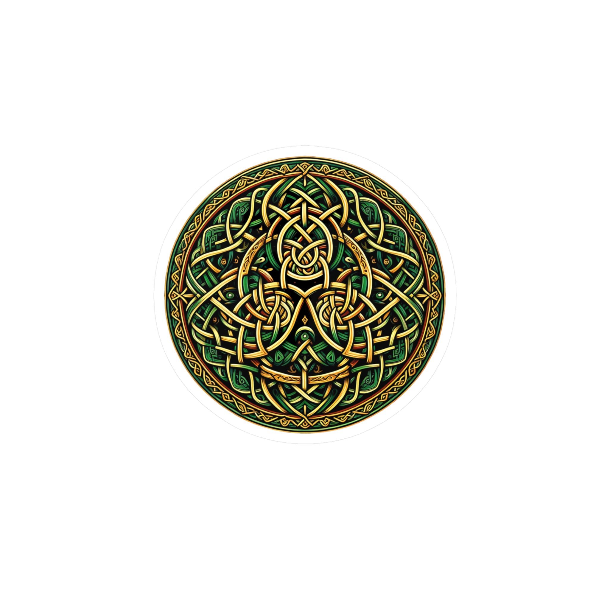 Celebrate your Celtic heritage wherever you may travel with this original Celtic knot design! This beautiful design features stunning Celtic knotwork in the colors of the Emerald Isle, green and gold, guaranteed to draw attention. This eye-catching decal is made with high-quality white vinyl and is water, scratch, and UV-resistant. With a removable adhesive that doesn't leave residue, this decal features a 1/8" kiss-cut border around the sticker and a satin finish. Choose between four sizes and proudly display your love of Celtic artistry and your Irish heritage!