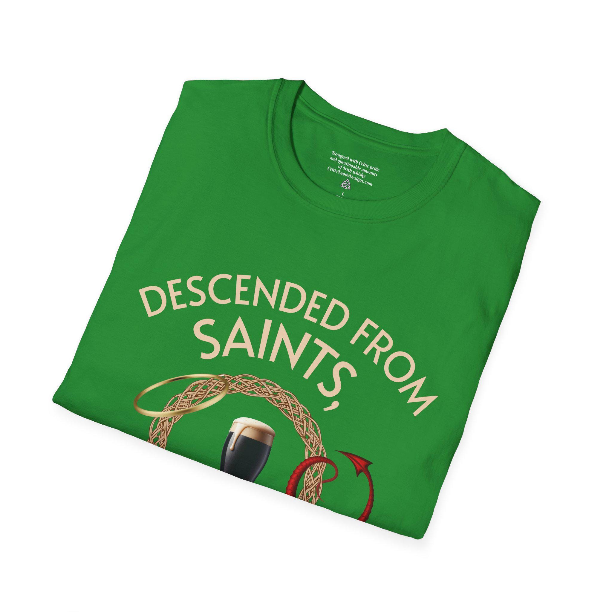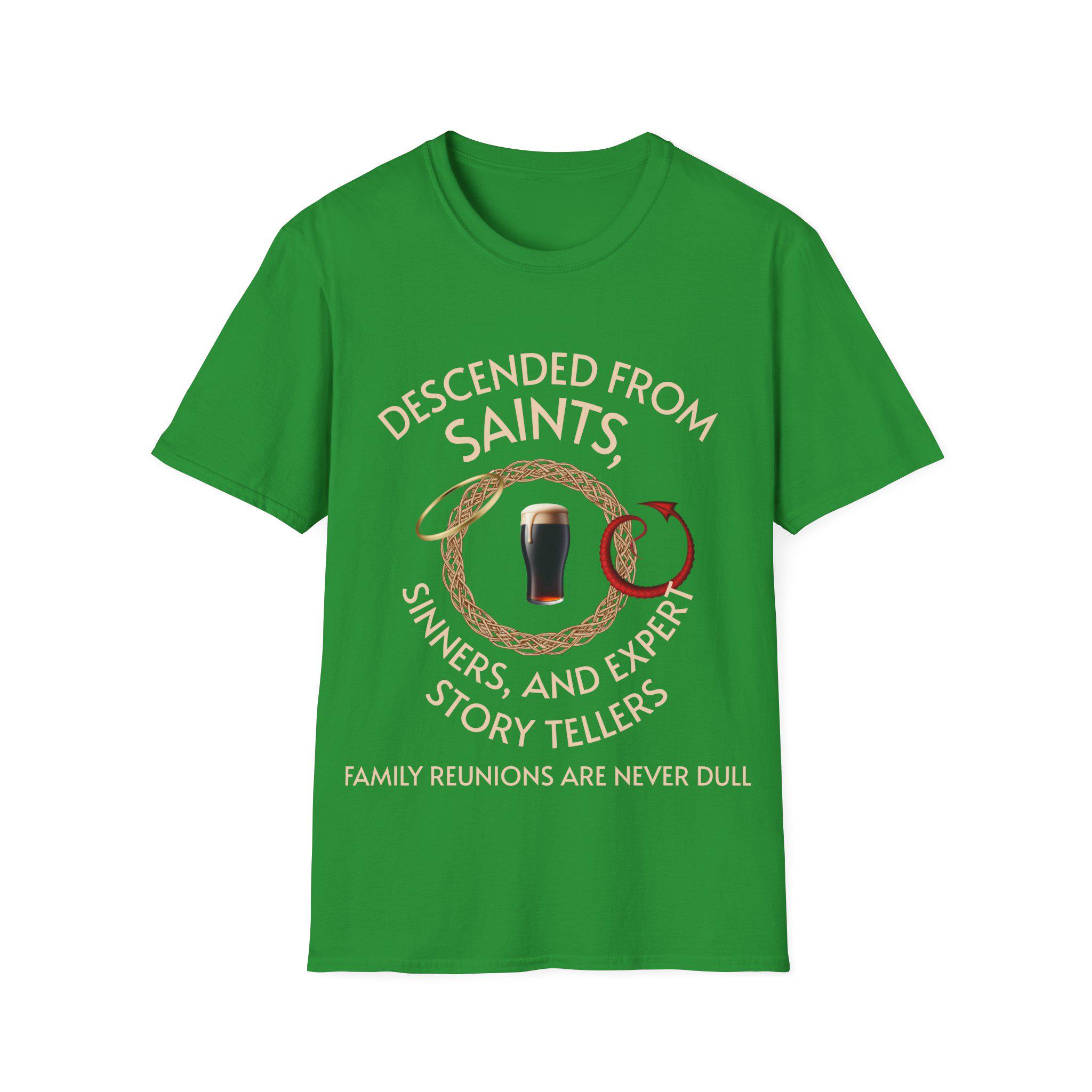 Featuring the witty saying “Descended from Saints, Sinners, and Expert Story Tellers” along with the note that family reunions are never dull, this funny but true tee perfectly captures the spirit of Irish ancestry. The design showcases a Celtic wreath adorned with a halo, a devil’s tail, and of course, a pint, because no Irish story is complete without one.