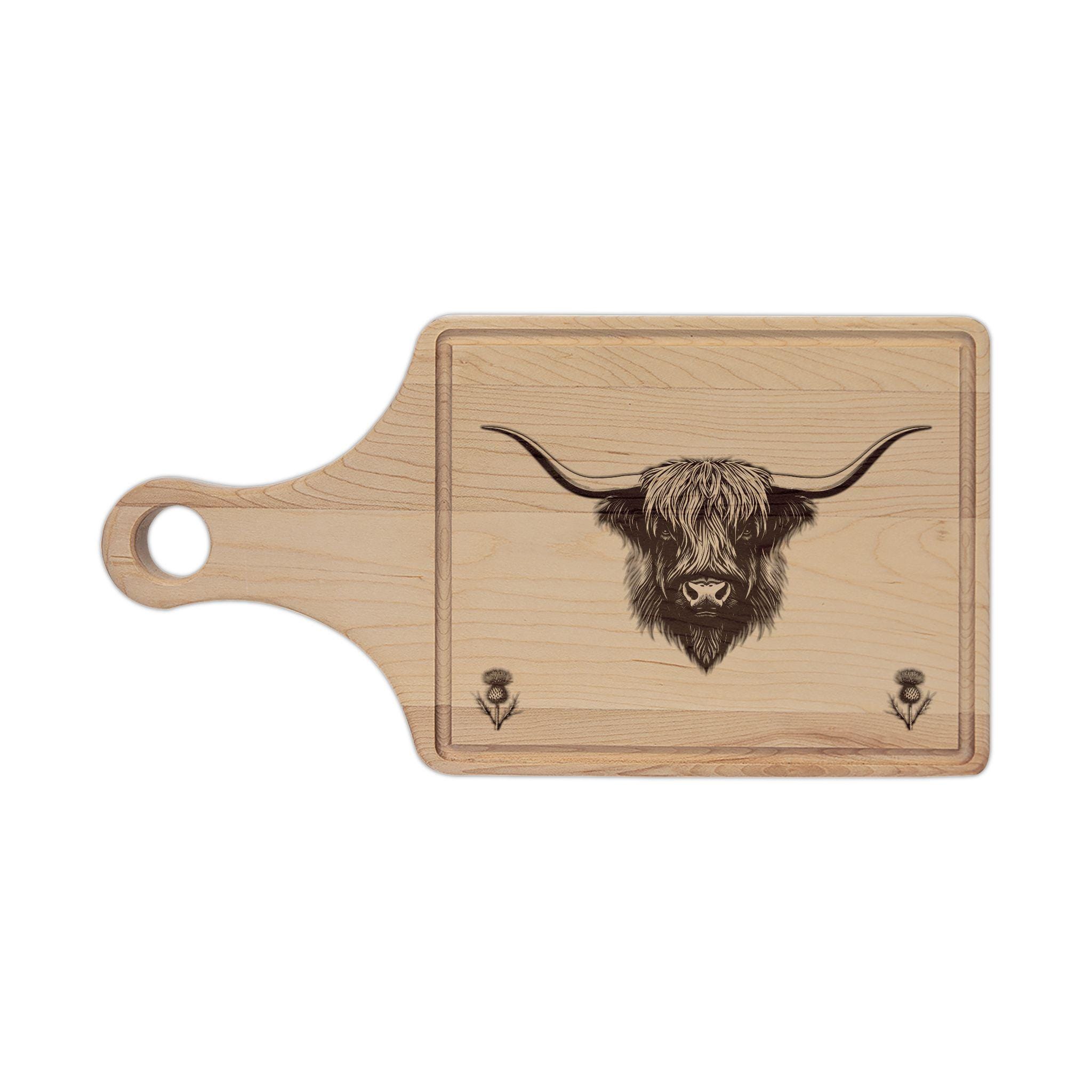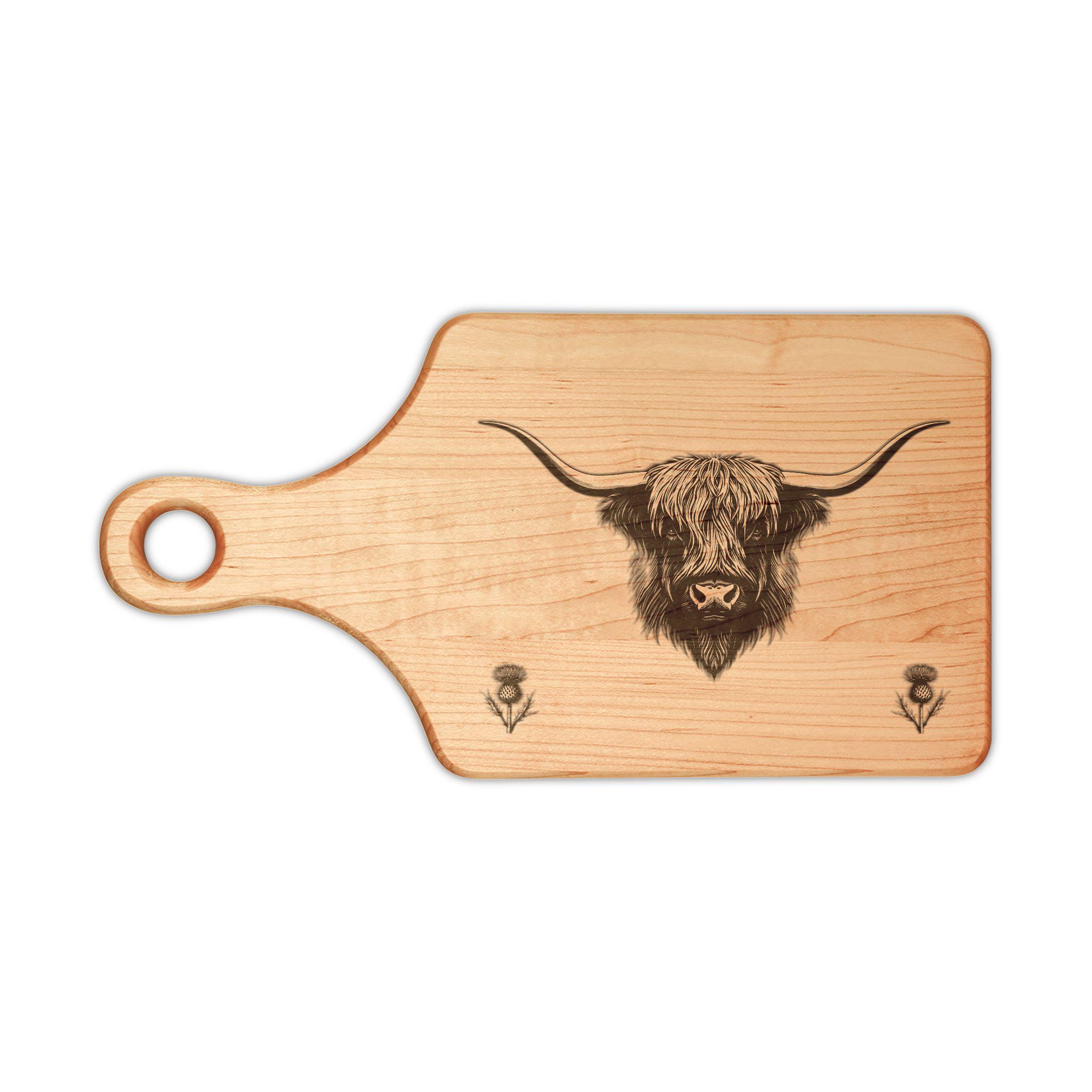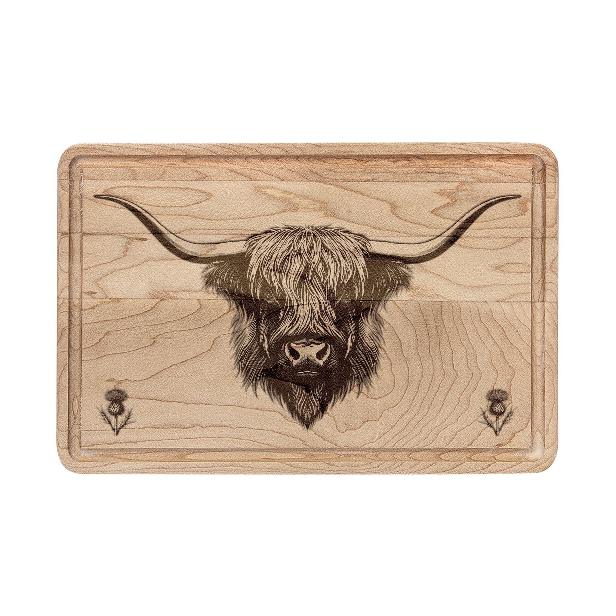 Celebrate Scotland and its rugged beauty with this beautifully crafted engraved maple cutting board. Made from premium maple wood, this elegant board features an iconic Highland Coo, beloved for its shaggy coat and gentle spirit, accompanied by two small Scottish Thistles that symbolize strength and national pride. Together, these elements capture the heart and charm of the Scottish Highlands.